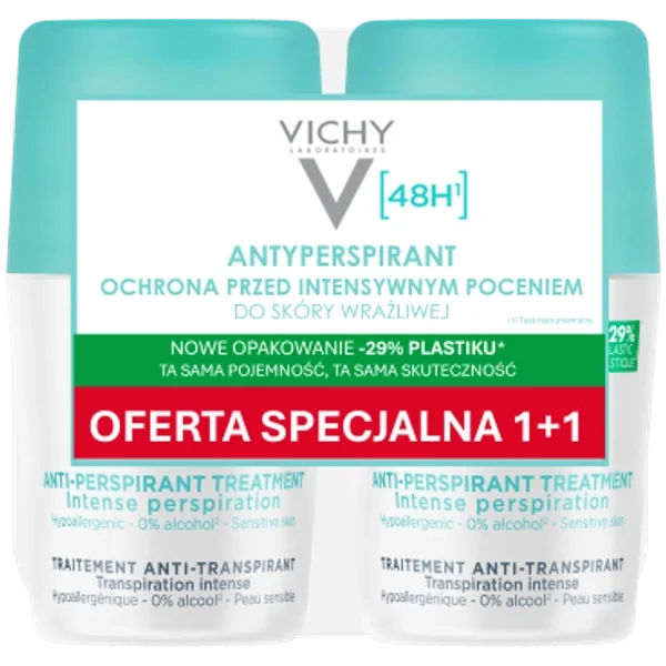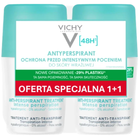 Vichy Traitement Anti-Transpirant Dwupak Antyperspirant Przeciw Nadmiernemu Poceniu 48h to wyjątkowo skuteczny antyperspirant w kulce, stworzony z myślą o osobach zmagających się z nadmiernym poceniem, które oczekują intensywnej ochrony i ultrawysokiej tolerancji dla skóry. Dzięki formule opartej na aktywnych składnikach hamujących wydzielanie potu produkt zapewnia świeżość, suchość oraz komfort przez 48 godzin. Woda Termalna z Vichy, znana z właściwości kojących i wzmacniających, dodatkowo łagodzi skórę i wspiera jej naturalną barierę. Dwupak to praktyczne i ekonomiczne rozwiązanie, idealne do codziennego stosowania lub podzielenia się z bliską osobą.