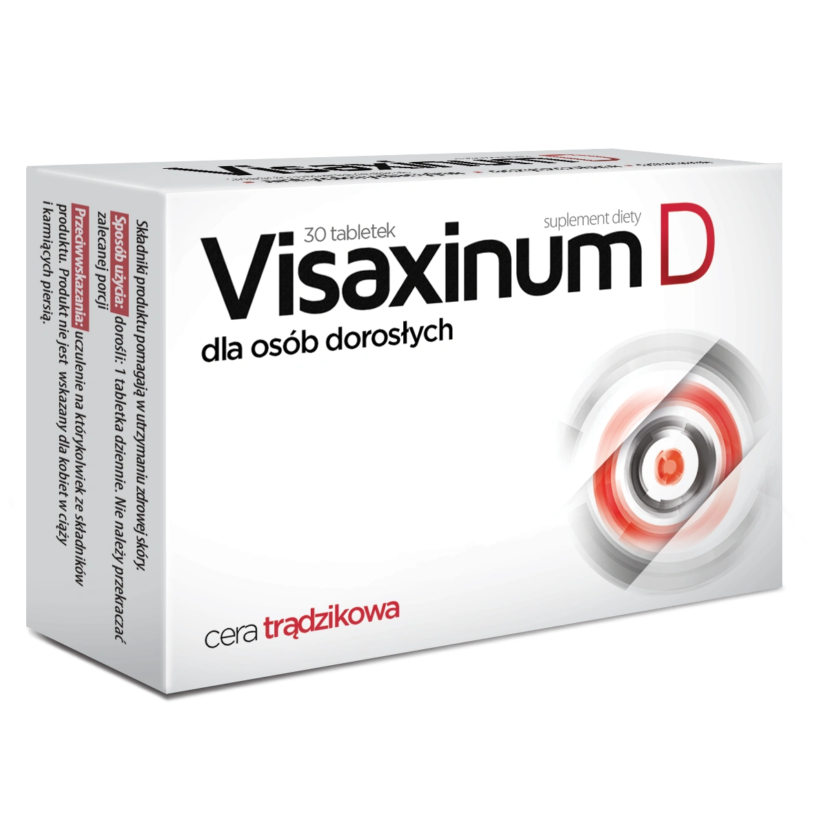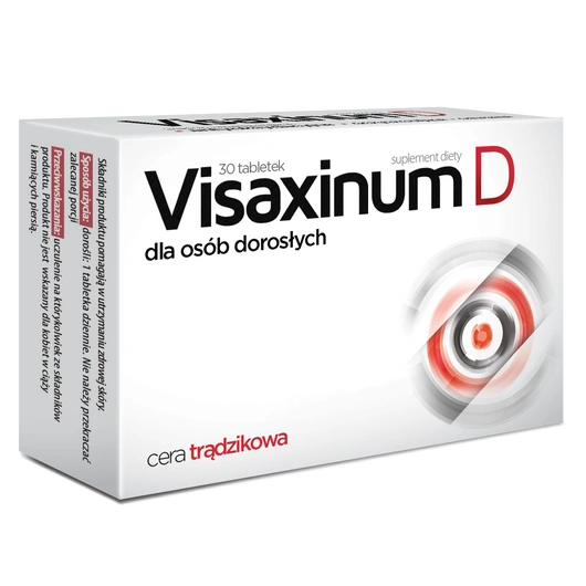 Visaxinum D to suplement diety, który wspiera zdrowie skóry dorosłych z cerą trądzikową. Trądzik u osób dorosłych często wiąże się z hormonami, poziomem glukozy we krwi lub stresem. Dzięki starannie dobranym składnikom, takim jak wyciąg z fiołka trójbarwnego, mniszek lekarski, niacyna, cynk, zielona herbata oraz melisa, Visaxinum D pomaga w regulacji hormonalnej, utrzymaniu prawidłowego poziomu cukru we krwi, a także wspiera dobre samopoczucie. To naturalne wsparcie, które wpływa na poprawę kondycji skóry oraz wspomaga zachowanie jej zdrowego wyglądu.