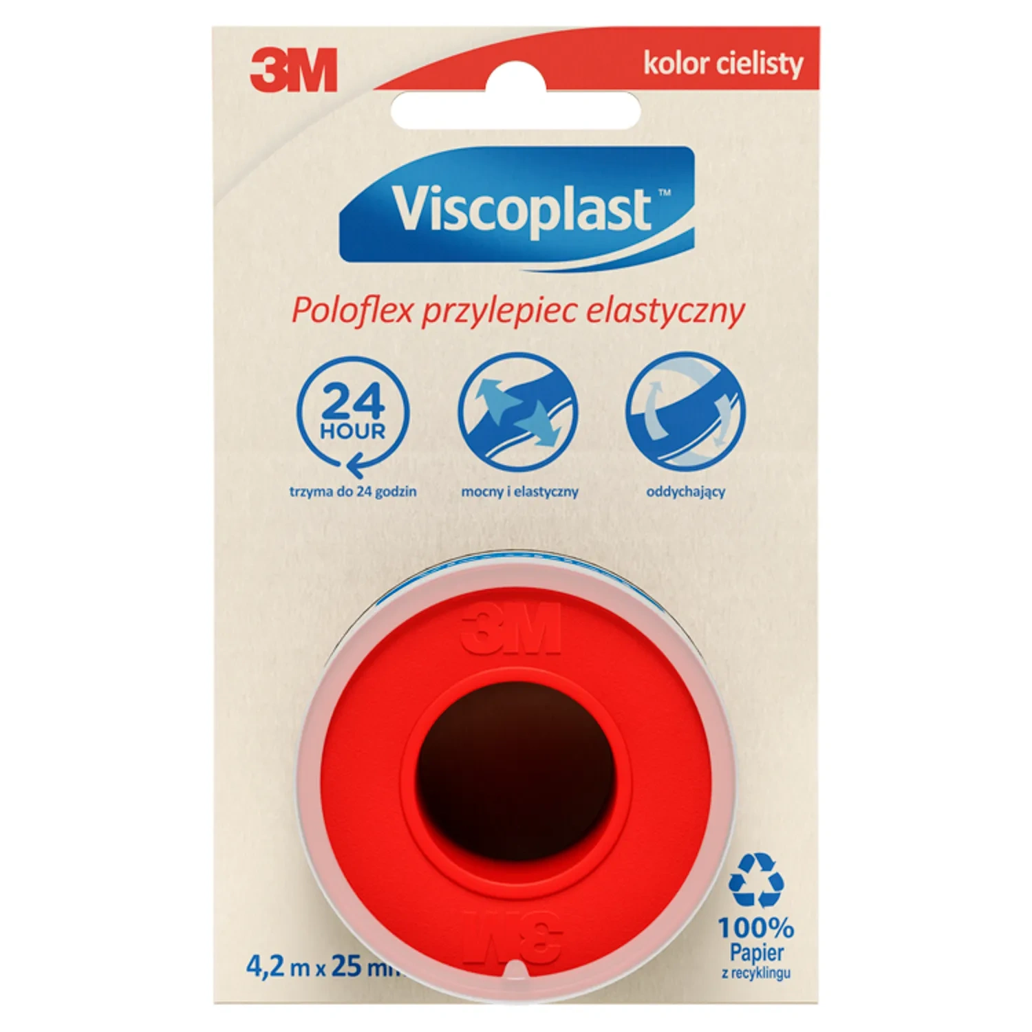 • Wytrzymała i elastyczna taśma tkaninowa w rolce, zapewniająca pewne mocowanie opatrunków nawet na ruchomych częściach ciała przez 24 godziny.