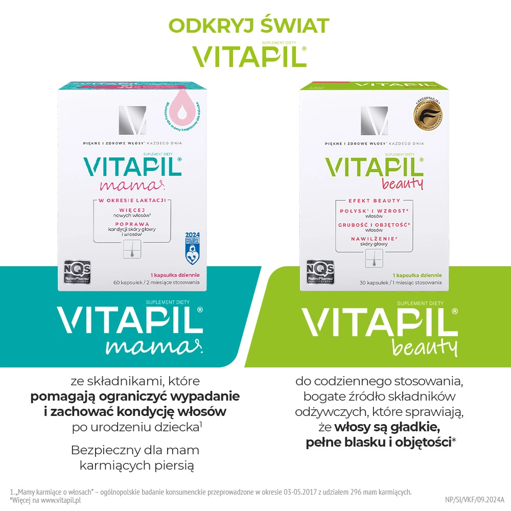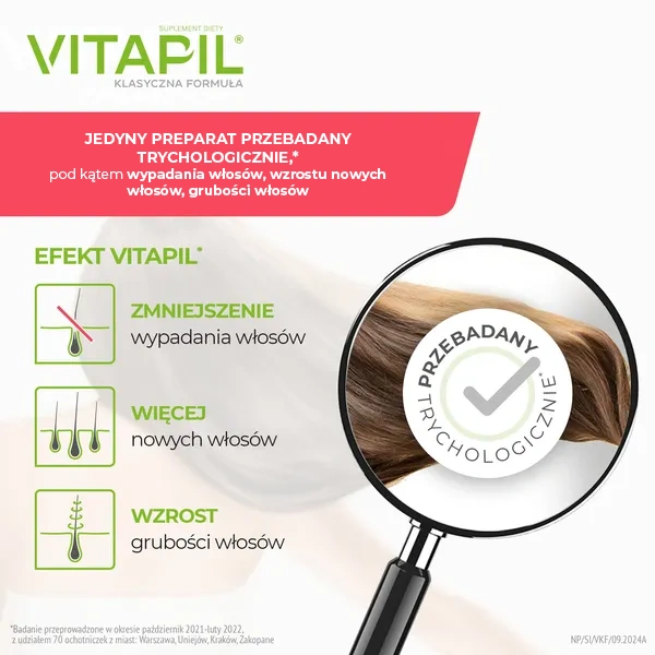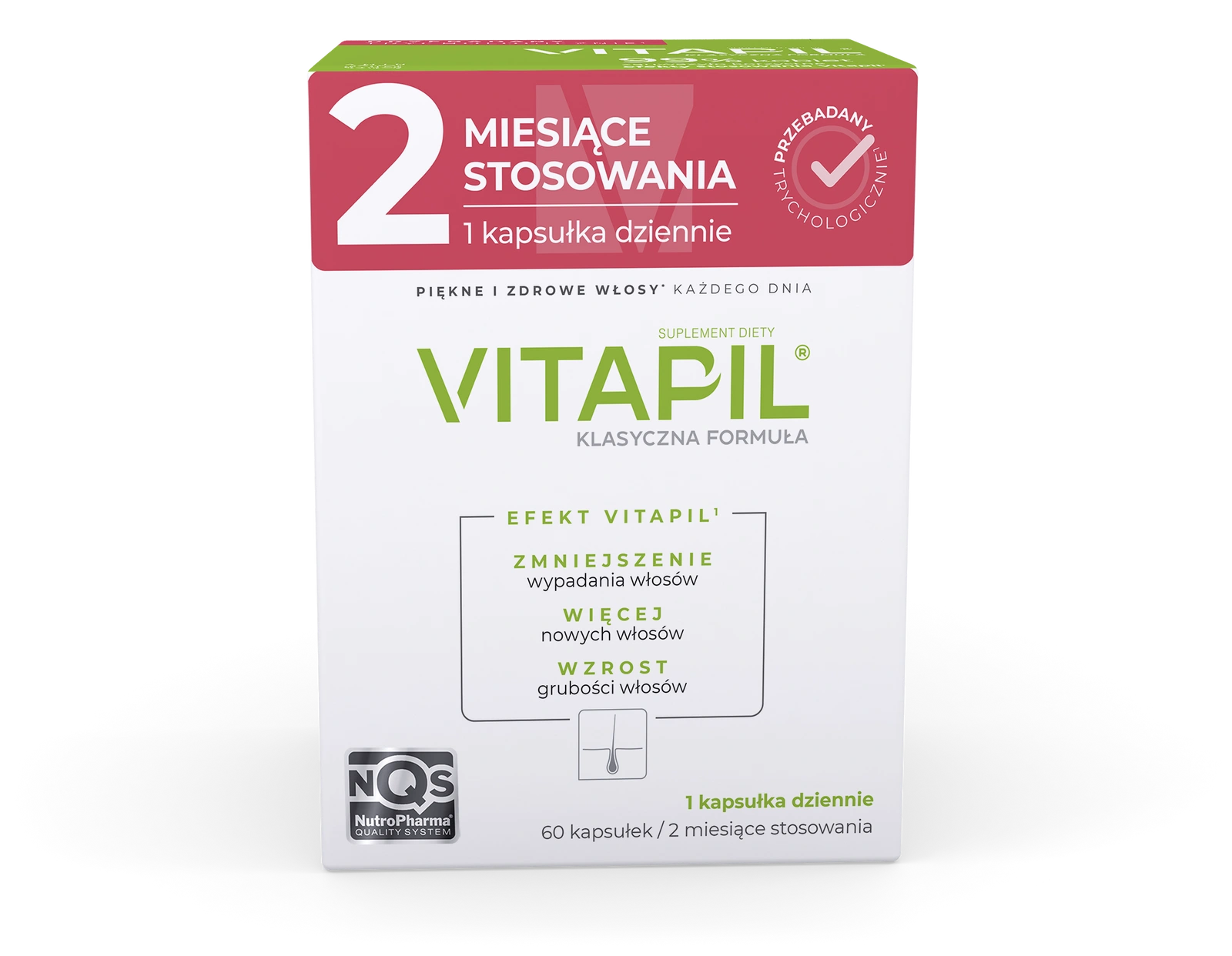 - VITAPIL® to suplement diety o starannie dobranym składzie, wspierający zdrowie włosów i skóry głowy. Zawarte składniki, takie jak biotyna, cynk i ekstrakt z bambusa, przyczyniają się do utrzymania prawidłowej kondycji włosów.