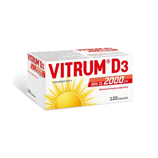 Vitrum® D3 2000 to suplement diety w kapsułkach, zawierający 2000 j.m. (50 µg) witaminy D naturalnego pochodzenia, rozpuszczonej w oleju z krokosza barwierskiego. Witamina D odgrywa kluczową rolę w utrzymaniu zdrowia – wspiera układ odpornościowy i mięśnie, pomaga zachować mocne kości i zęby oraz ułatwia wchłanianie wapnia i fosforu. Dodatkowo bierze udział w procesie podziału komórek i może zmniejszać ryzyko upadków związanych z osłabieniem mięśni u osób starszych. Preparat przeznaczony jest dla dorosłych, kobiet w ciąży i karmiących piersią oraz osób po 60. roku życia.