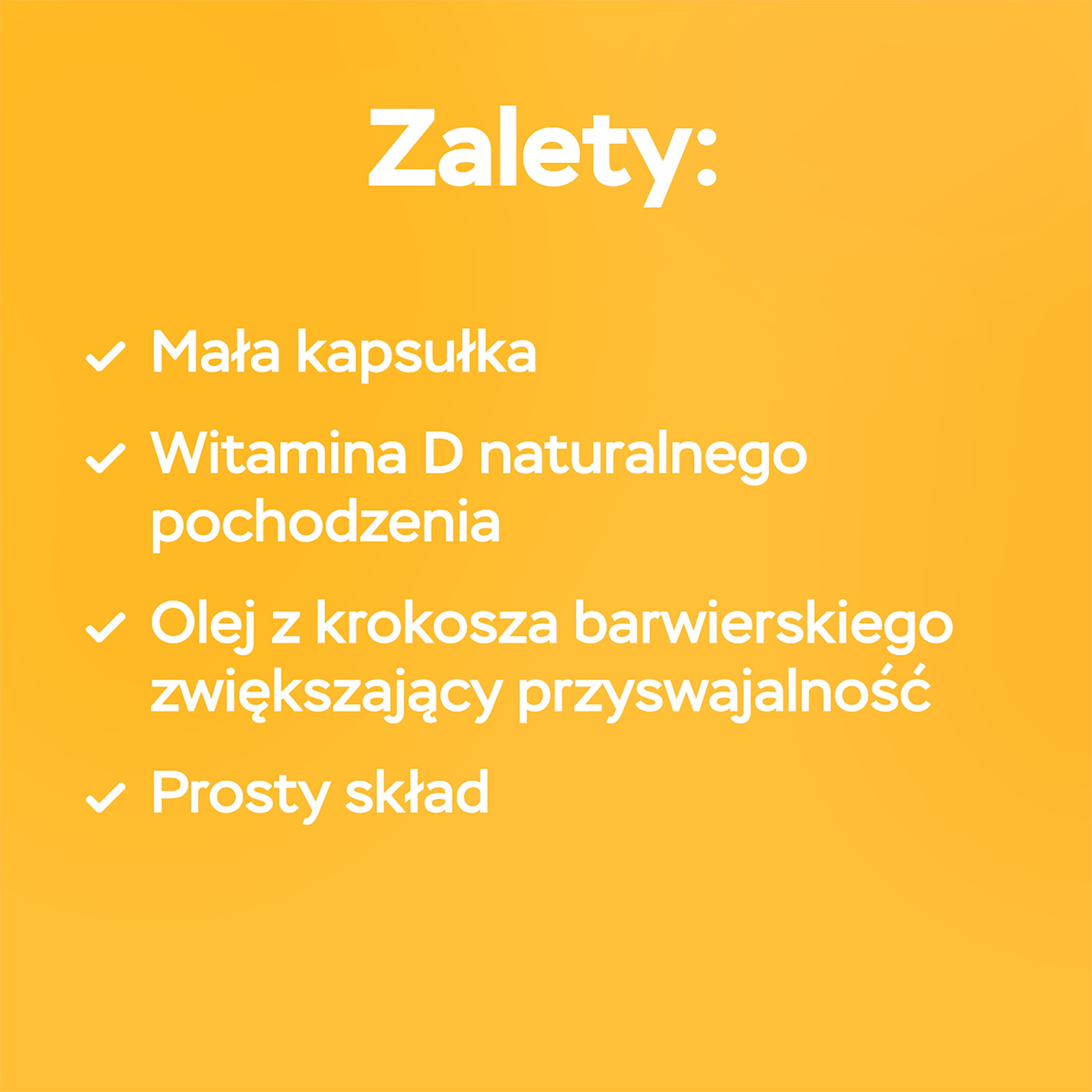 - Suplement diety Vitrum D₃ 2000 j.m. dostarcza 2000 j.m. witaminy D₃ w każdej kapsułce, wspierając zdrowie kości, zębów oraz prawidłowe funkcjonowanie układu odpornościowego.