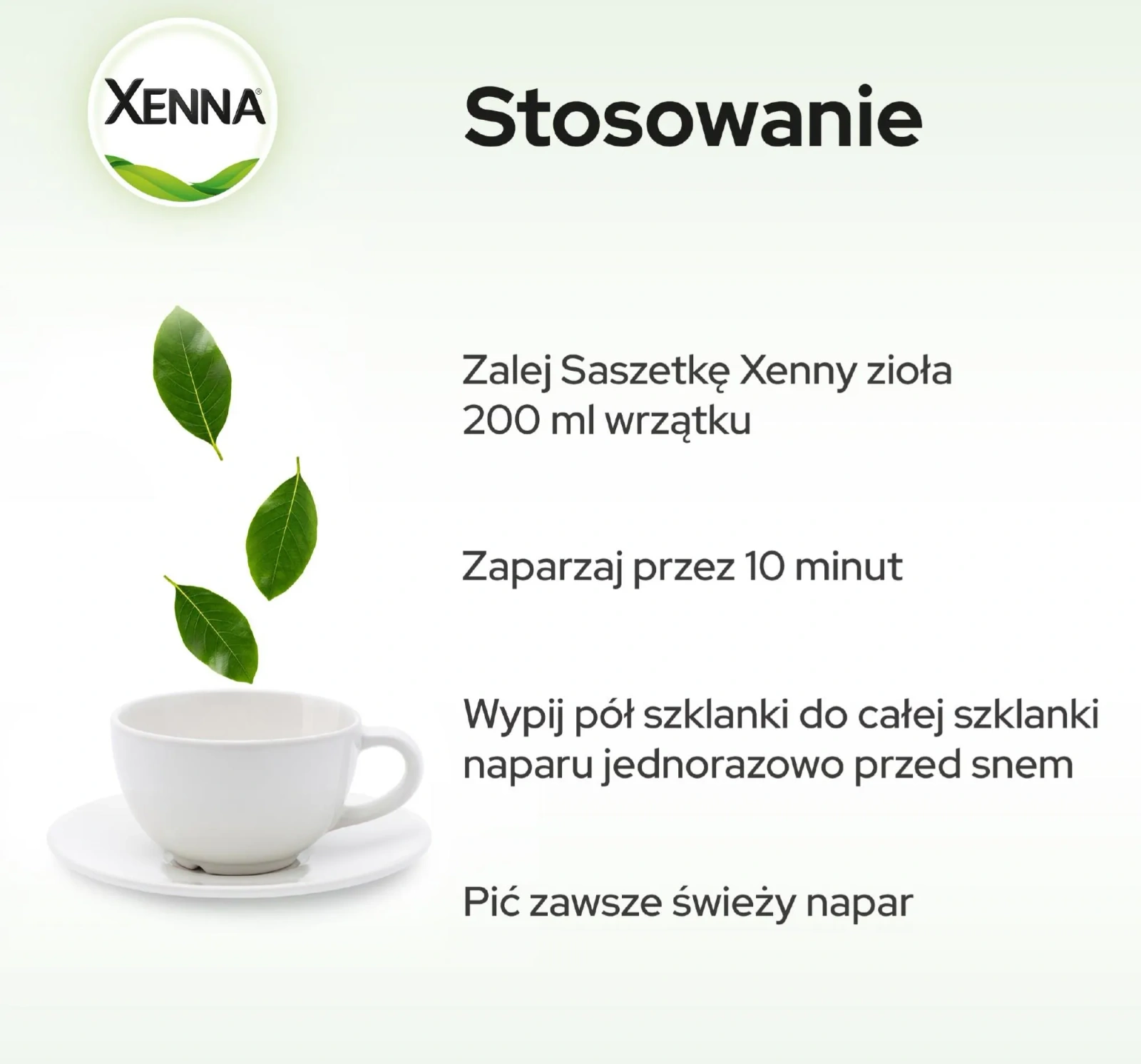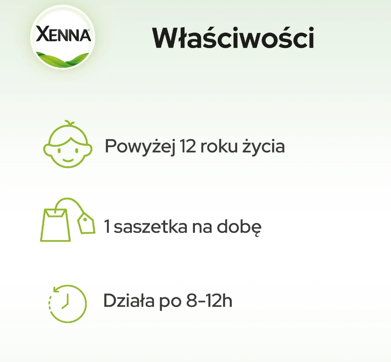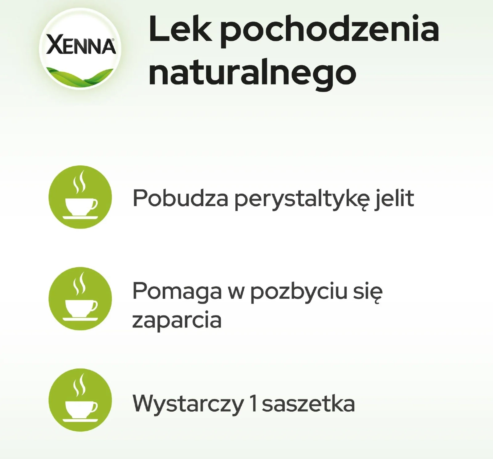 Każda saszetka preparatu Xenna zawiera 30 mg glikozydów hydroksyantracenowych, przeliczonych na sennozyd B. Substancje aktywne pochodzące z liści senesu działają drażniąco na ściany jelita grubego, pobudzając jego perystaltykę oraz hamując wchłanianie zwrotne wody z przewodu pokarmowego. W efekcie lek rozmiękcza masy kałowe i ułatwia ich przesuwanie, co prowadzi do wypróżnienia.