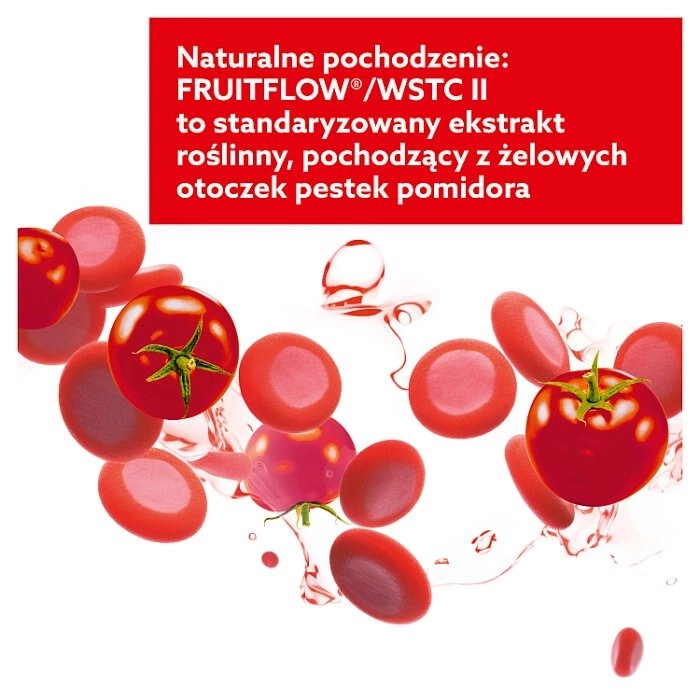 Fruitflow®/WSTC II – opatentowana kompozycja polifenoli, nukleotydów i izoflawonoidów z pomidora, wspierająca prawidłowy przepływ krwi i funkcjonowanie płytek krwi.