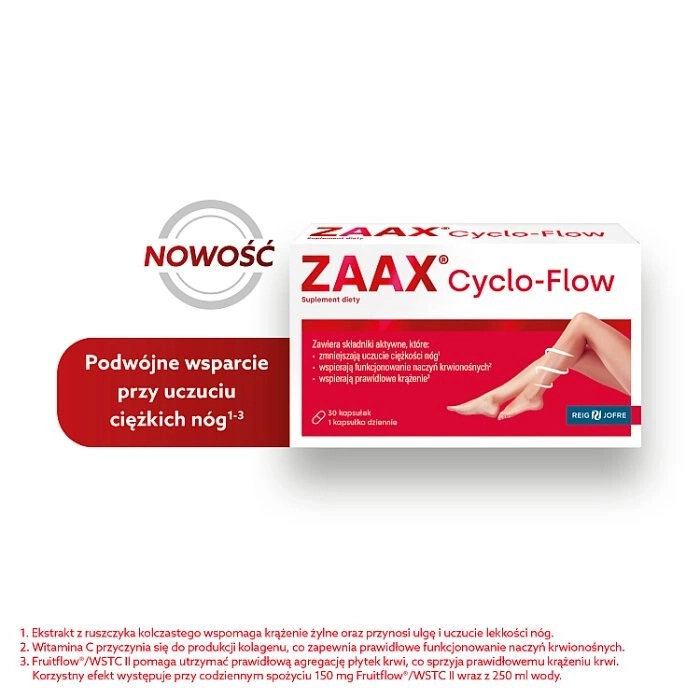 - Zaax Cyclo-Flow – suplement diety wspierający krążenie żylne, zawierający ruszczyk kolczasty, Fruitflow®, hesperydynę i witaminę C dla zdrowia naczyń i lekkości nóg.