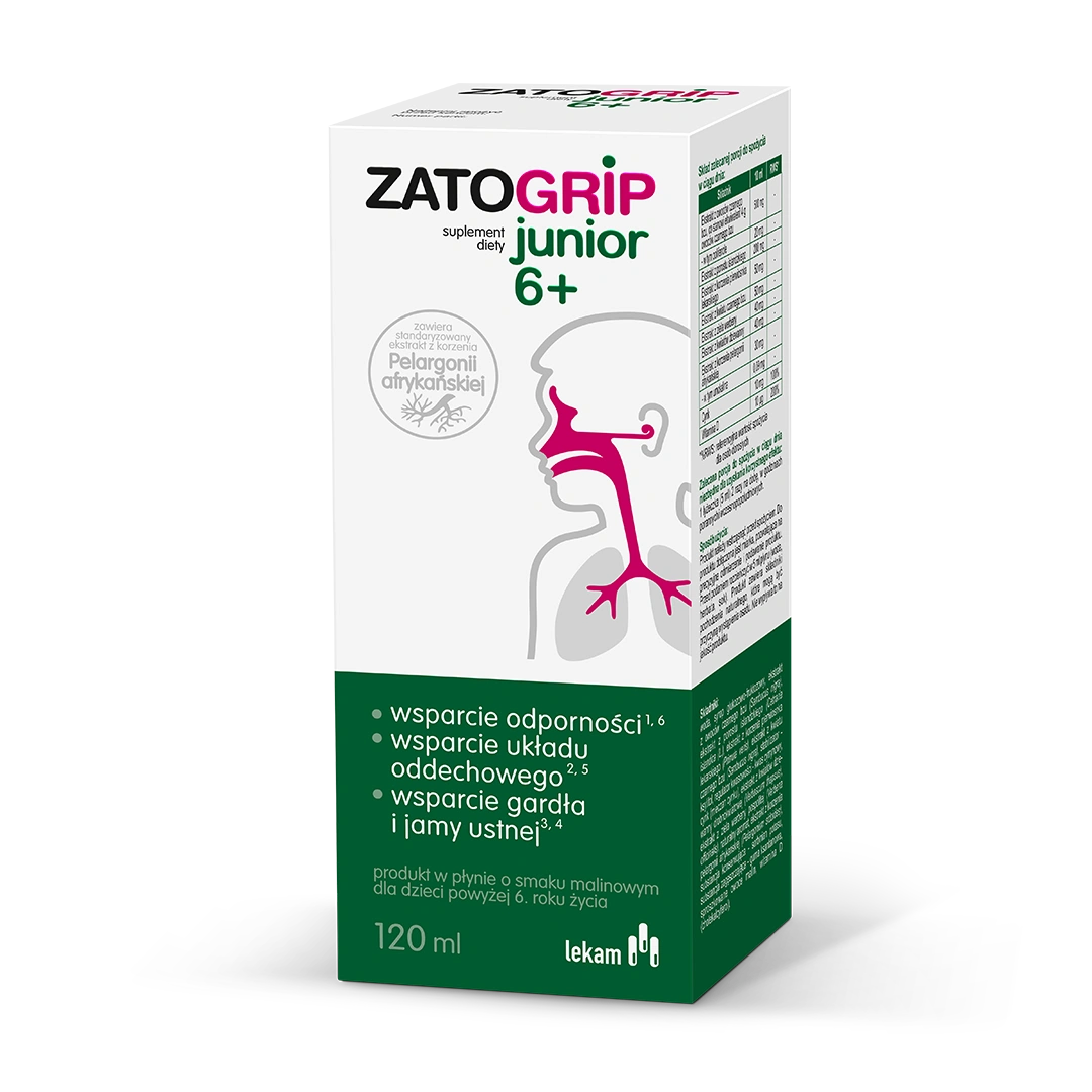 Zatogrip Junior 6+ to suplement diety w formie syropu, opracowany z myślą o dzieciach powyżej 6. roku życia. Preparat łączy standaryzowane ekstrakty roślinne – z pelargonii afrykańskiej, porostu islandzkiego, owoców i kwiatów czarnego bzu, pierwiosnka, dziewanny oraz werbeny. Skład został wzbogacony cynkiem, który wspiera odporność i ochronę komórek przed stresem oksydacyjnym. Syrop pomaga wspierać prawidłowe funkcjonowanie układu oddechowego, gardła, krtani, strun głosowych oraz jamy ustnej dziecka.