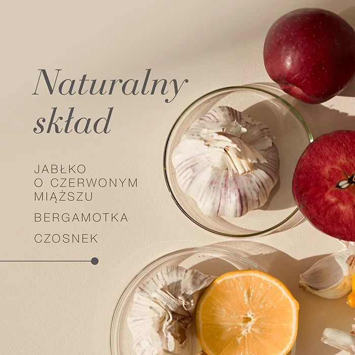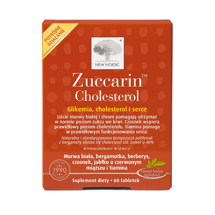 Zuccarin Cholesterol to suplement diety opracowany z myślą o osobach, które chcą w sposób naturalny wspierać prawidłowy metabolizm glikemiczny, utrzymać cholesterol na właściwym poziomie oraz zadbać o pracę serca. Formuła łączy ekstrakty z morwy białej, bergamotki, czosnku, berberysu i jabłka o czerwonym miąższu, wzbogacone o chrom i tiaminę. Składniki te zostały starannie wyselekcjonowane, suszone i ekstrahowane tak, aby zachować ich najwyższą jakość oraz korzystne właściwości. Suplement jest odpowiedni dla wegan i bazuje na tradycji roślinnych ekstraktów charakterystycznej dla skandynawskiej marki New Nordic.